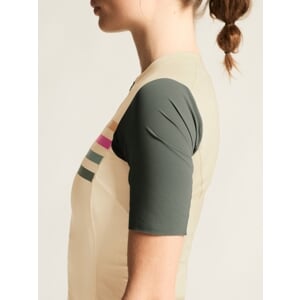 Cyklistický dres CRAFT Endur Training je primárně určen pro náročné cyklistky, které tvrdě trénují několikrát týdně. Je vyroben z vysoce funkčního, strečového a příjemného materiálu, který skvěle odvádí vlhkost od těla pryč a udržuje tělo v optimální provozní teplotě i při velmi intenzivní jízdě. Ergonomický střih se maximálně přizpůsobí pozici cyklistky na kole, takže výrazně přispěje ke komfortnímu pocitu v průběhu celého švihu. Na zádech jsou čtyři kapsy, z toho jedna je uzavíratelná zipem. Spodní lem dresu je ukončen pružnou gumou se silikonovým potiskem z vnitřní strany.